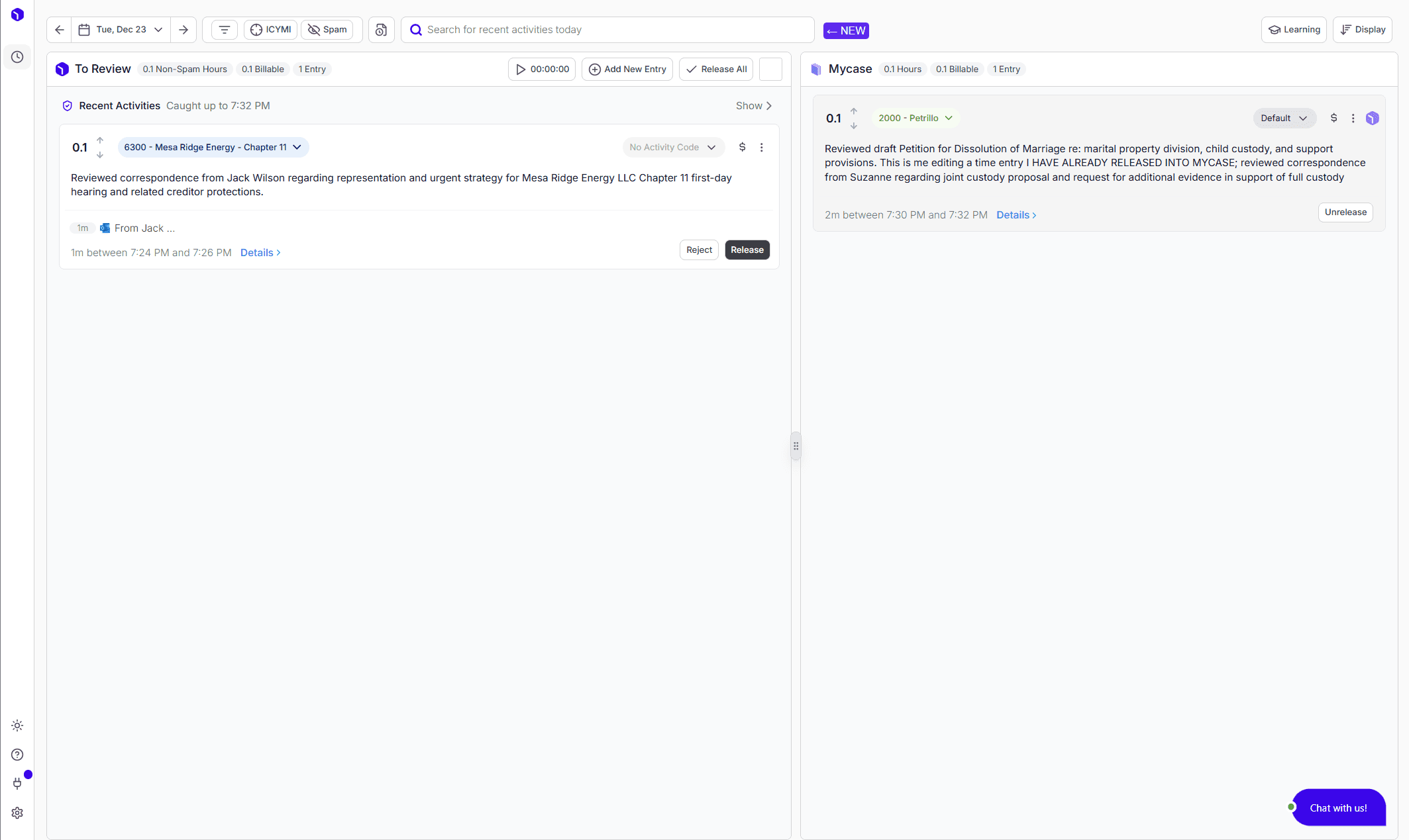 Review your entries with a single click, make any adjustments, and sync to MyCase.